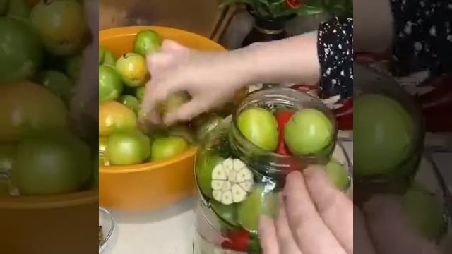 Хрустящие зелёные помидоры Рецепт: ▫️Помидоры ▫️Чеснок — 5-6 зубчиков ▫️Острый перец — 1 шт. (по вкусу) ▫️Зонтик укропа — 2 шт. ▫️Лавровый лист — 2 шт. ▫️Перец горошком — 6-7 шт. ▫️Сельдерей — 5-6 веточек Для рассола: ▫️Соль — 2 ст. ложки ▫️Сахар — 1 ст. ложка ▫️Кипяток