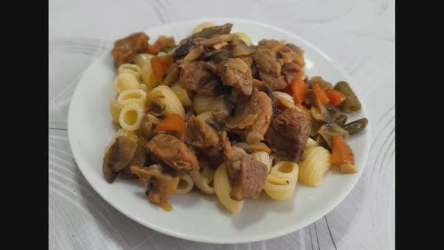 Свинина с фасолью и грибами в соевом соусе