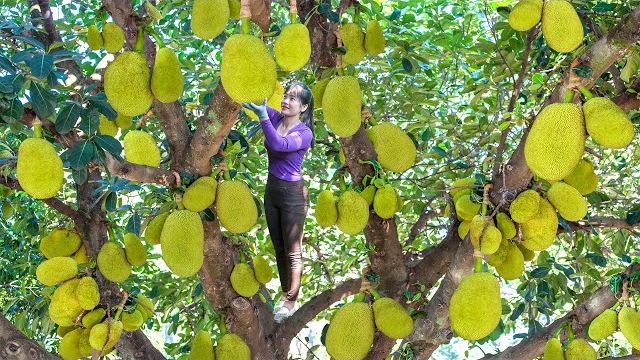 Собираю урожай с джекфрутового дерева. Везу на мотоцикле продавать. Нхат. Вьетнам