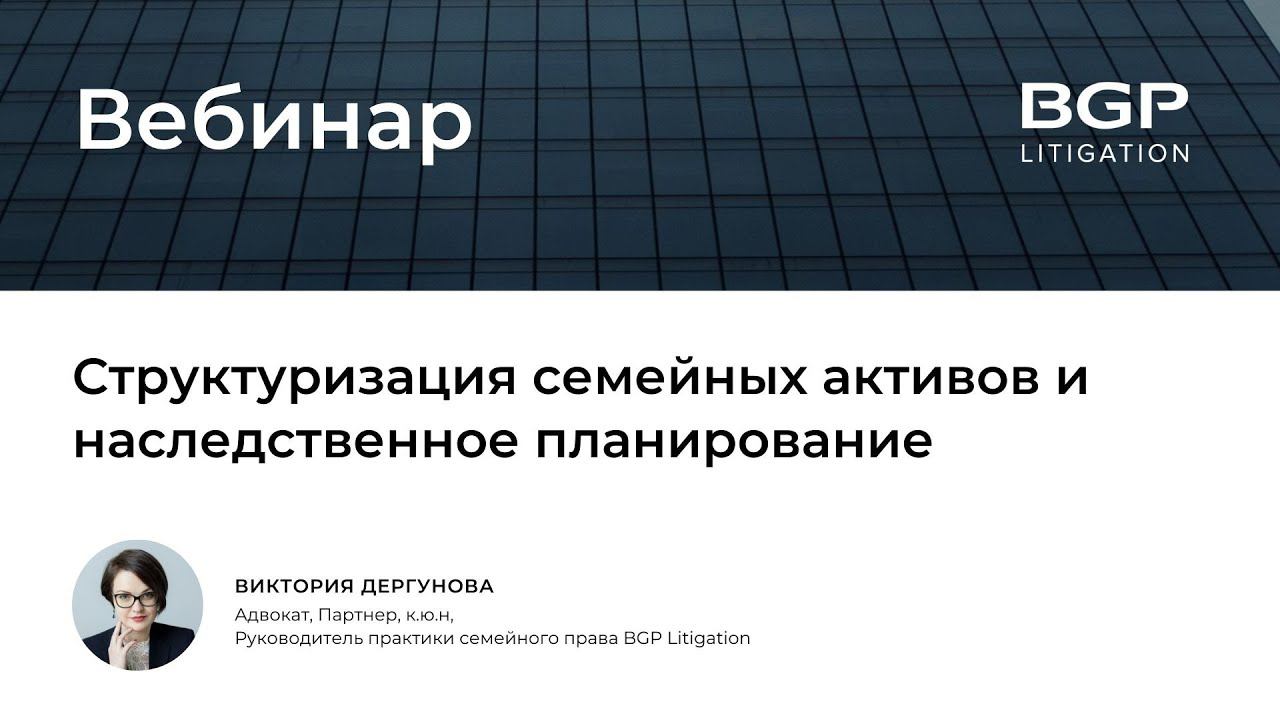 В последнее время мы очень часто слышим такие выражения как, «неподготовленное наследство», «дробление активов», «стихийное наследование», «траст», «наследственный фонд», «душеприказчик», «завещание» и т.п. Что это значит и кому может быть выгодно, - предлагает разобрать адвокат, к.ю.н., партнер и руководитель практики семейного права BGP Litigation Виктория Дергунова. В ходе вебинара затронуты правовые аспекты заключения брачного договора и алиментных соглашений, как инструментов структурирования семейных активов в целях наследственного планирования. Присоединяйтесь к BGP Litigation в социальных сетях: ▪️Facebook https://www.facebook.com/bgplitigation ▪️Telegram https://msto.me/card1620203889/ Связаться с нами: ▪️https://bgplaw.com ▪️office@bgplaw.com ▪️+7 (495) 777 28 20