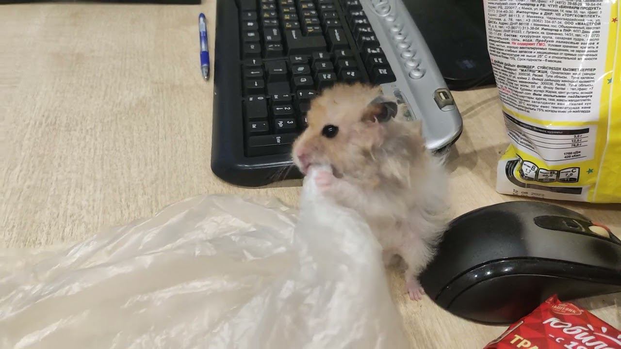 Хомяк хомячит пакет.