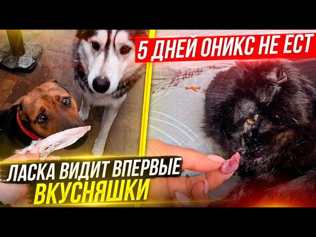 Оникс истощен, постоянно делаю процедуры. Раздаю лакомства с посылки. Купила животным еды и домик.