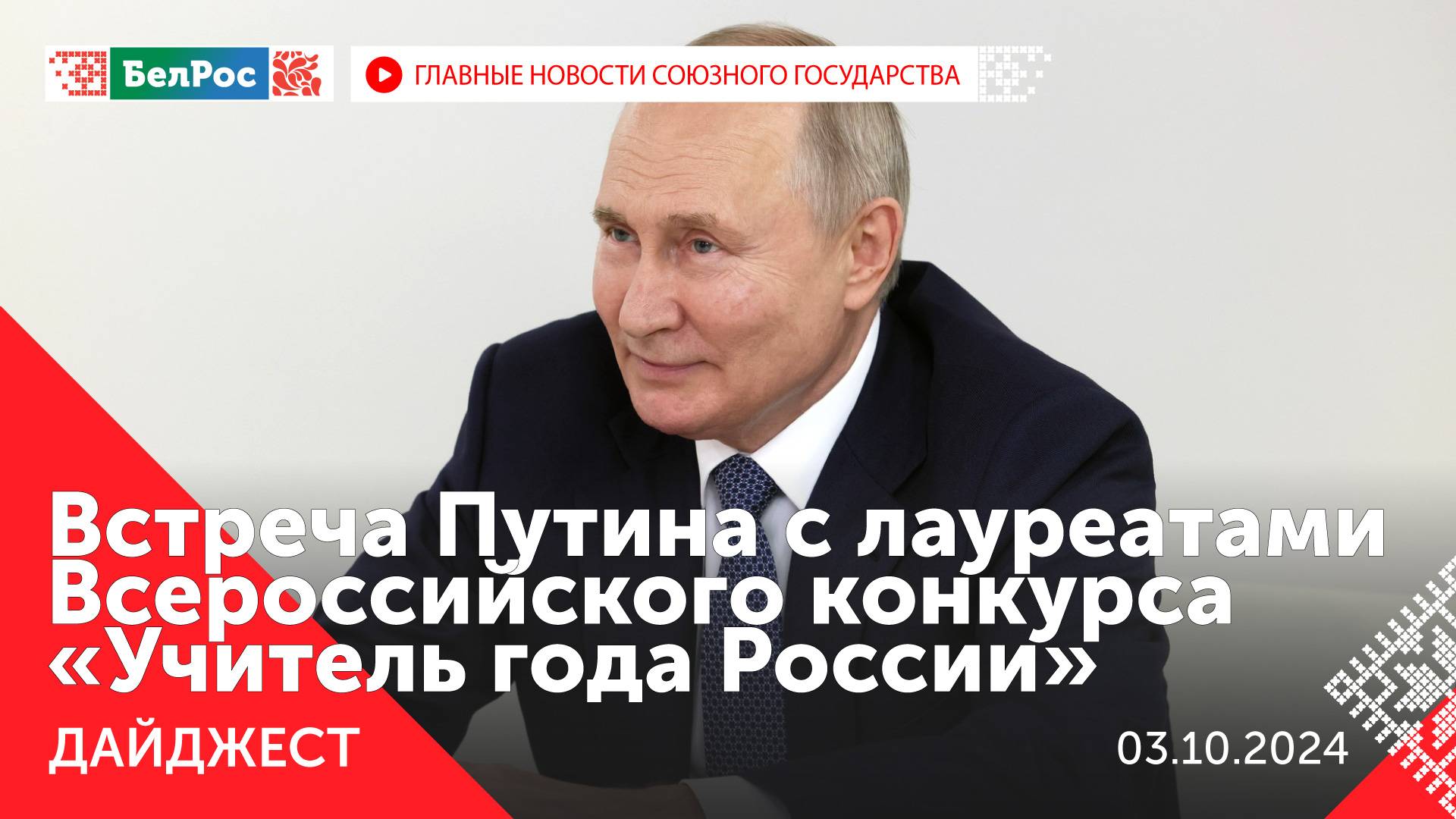 *Главное на 3 октября 21:00* Закадровый текст озвучивает *ИИ Кирилл* - Лучшие учителя России пообщались с Владимиром Путиным. - Александр Лукашенко провёл встречу с премьер-министром Азербайджана Али Асадовым. - Российские Президент назначил ветеранов СВО на высокие должности. - В 2025-м форум регионов РФ и РБ пройдёт в Нижнем Новгороде. - В России Госдума рассмотрит 5 законопроектов против нелегальной миграции. - Бочаров: Волгоградская область готова принять форум с участием России и Беларуси. - Раздел "Сделано в Беларуси" появится на популярном маркетплейсе. - Сотни экспонатов представили на выставке "История в объективе" в Музее Победы. - В Хабаровске ликвидируют пожар в музыкальном театре. - Россия отправила в Ливан 33 тонны гуманитарной помощи. - Небензя: власти Израиля хотят спровоцировать прямой конфликт между Ираном и США. - Не стало ведущего телеканала "БелРос" Александра Бунина. - На Камчатке спасли застрявших на мели косаток. - ФСБ задержала украинских шпионов при попытке проникновения из Литвы в Россию. - ВС РФ за ночь сбили больше ста БПЛА. Смотрите главные новости Союзного государства на телеканале БелРос. Ссылки на наши соц. сети Сайт: http://belros.tv/ Telegram: https://t.me/belrostv Одноклассники: https://ok.ru/group/55657426976918 ВКонтакте: https://vk.com/belrostv TikTok: https://www.tiktok.com/@belros_tv?_t=... RuTube: https://rutube.ru/channel/23501830/ Яндекс. Дзен: https://zen.yandex.ru/belrostvv Наши подкасты на Яндекс. Музыке: https://music.yandex.ru/album/25615251 #СоюзноеГосударство #главныеновости #новостисегодня