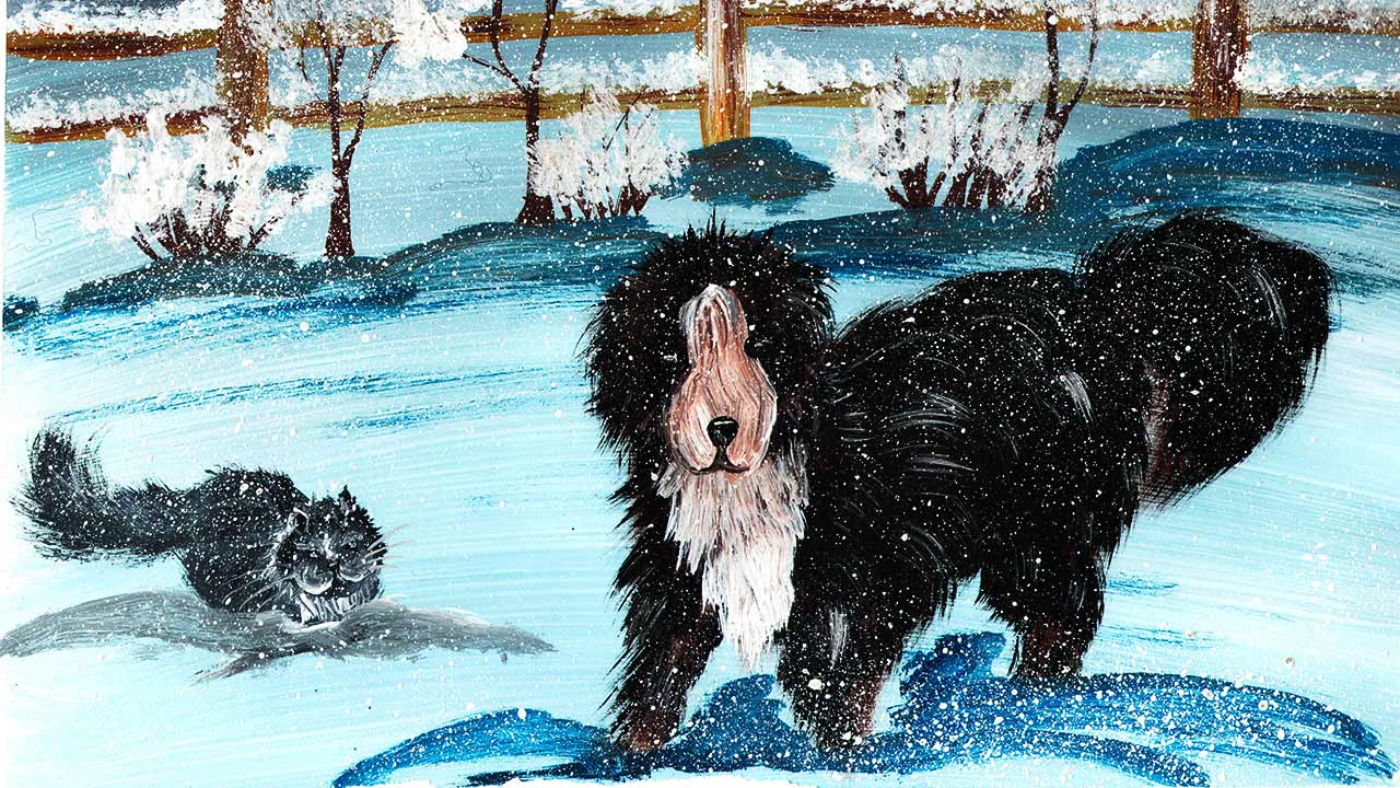Нарисуем собаку и кошку. Рисуем зимний пейзаж. Рисуем зиму в деревне. Правополушарное рисование.