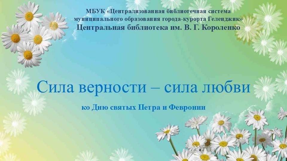 Центральная библиотека им. В. Г. Короленко подготовила виртуальную композицию «Сила верности – сила любви», посвященную Дню святых Петра и Февронии, который отмечается 8 июля как День семьи, любви и верности и приурочен к православному дню памяти святых князя Петра и его жены Февронии - покровителей семьи и брака в православной традиции. Композиция предназначена для всех, кого глубоко волнует данная тема и всех, кто имеет отношение к семейным традициям, любви, взаимоуважения.