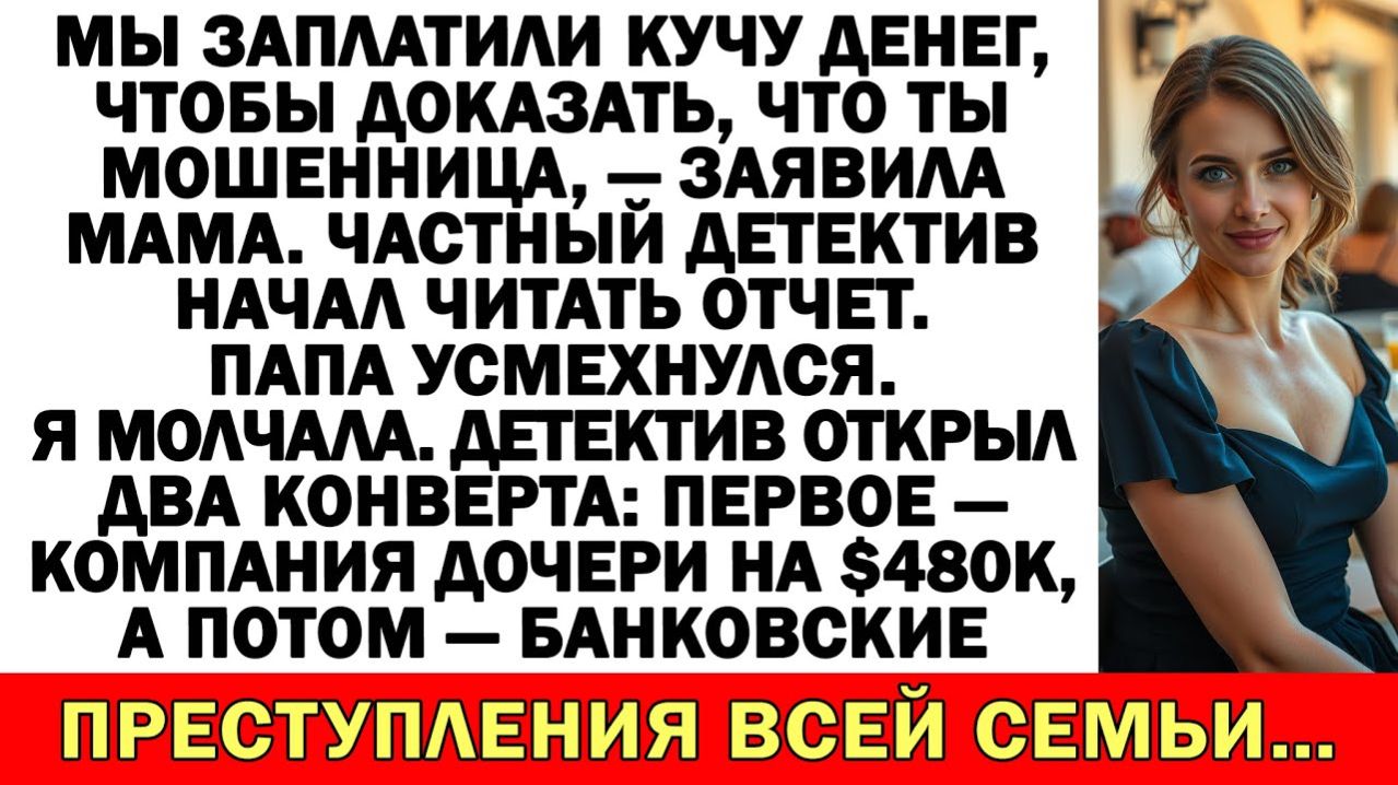 Мы заплатили кучу денег, чтобы доказать, что ты мошенница, — заявила мама. Частный детектив начал читать отчет. Папа усмехнулся. Я молчала. Детектив открыл два конверта: первое — компания дочери на $480K, а потом — банковские преступления всей семьи… Подборка историй из жизни с неожиданной концовкой: Истории из жизни| После развода муж ушёл. А его мама пришла… с багажом и без спроса. |Аудио рассказы - https://rutube.ru/video/4d565ef2db53df57c3a3570f94dd3361/ Свекровь учила меня семейной жизни… Муж поддакивал! Теперь живет у нее на раскладушке! - https://rutube.ru/video/a45ba8d386322b28a3b1acd16bc8c7a8/ Истории из жизни| Свекровь всполошилась |Аудио рассказы |Жизненные истории - https://rutube.ru/video/9b97e109cbd537dde3996440fc992e7c/ Муж решил вписать в мою квартиру свою маму после развода — но его ждала повестка! - https://rutube.ru/video/1a71e51ffddb89c1c7683bc2cdd1b621/ Истории из жизни| Родные решили, что все бесплатно, а я вложила 8500$ - https://rutube.ru/video/4b188c114d0fd7d51a6f1d515caf3a80/ Если любите сильные аудиорассказы и истории из жизни — этот рассказ вас не отпустит до финала. Здесь оживают настоящие семейные истории – драматичные, забавные, порой неожиданные, но всегда жизненные. Свекрови и невестки, тёщи и зятья, братья и сёстры – у каждого своя правда, свои эмоции и свои скандалы. Узнаваемые ситуации, острые конфликты и неожиданные развязки ждут тебя в каждом новом видео! Подпишитесь и напишите, как бы вы поступили на месте главных героев. Жизнь пишется без сценария, но каждая история оставляет след... #аудиорассказ #историяизжизни #жизненныеистории #семейнаядрама #предательство Аудиорассказ, аудиорассказы, история из жизни, истории из жизни, жизненная история, жизненные истории, семейная драма, про свекровь, про измену, про предательство, сильная история, рассказ до слёз, с неожиданной развязкой
