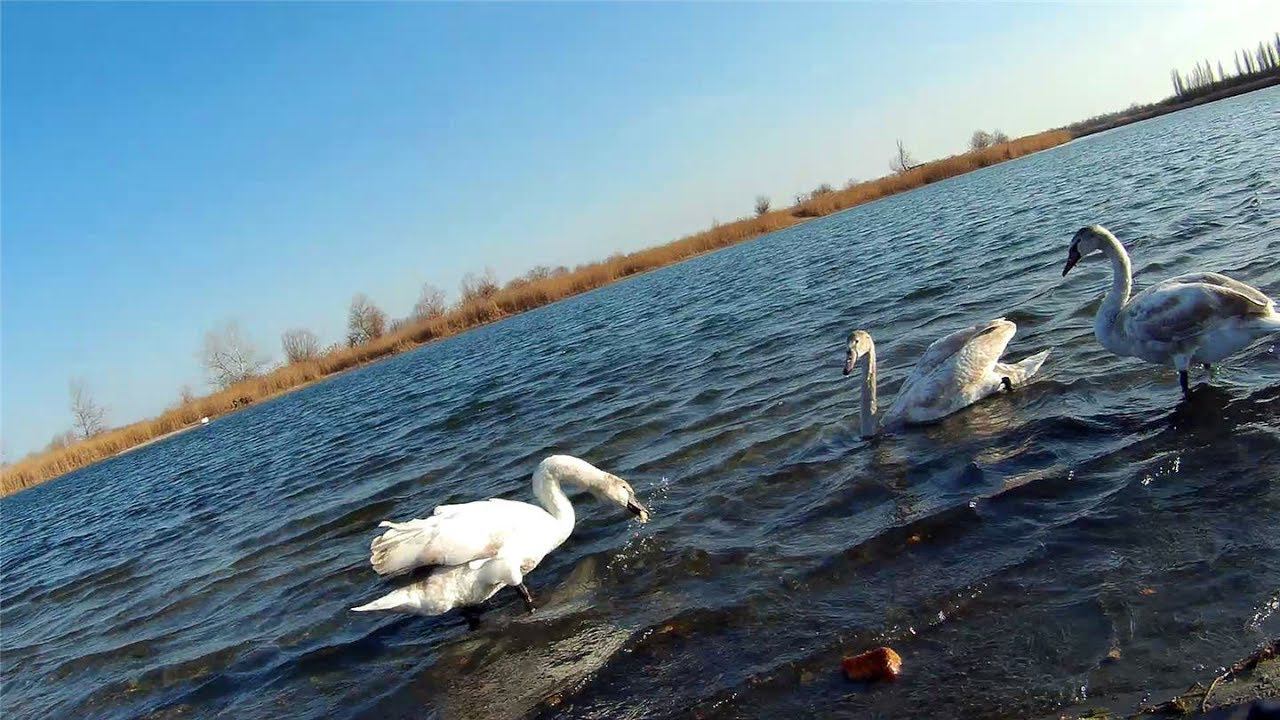 Кормление лебедей,лебеди земуют на городском озере.