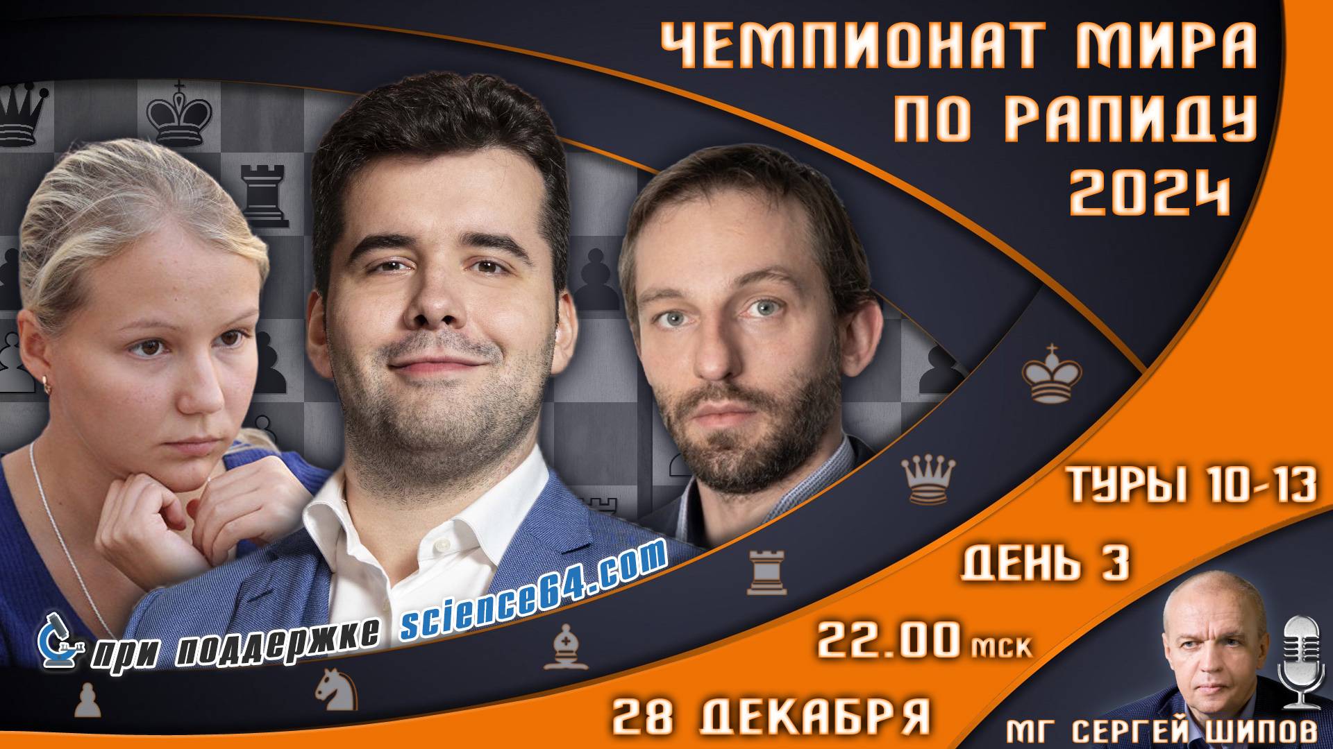 Чемпионат мира по рапиду! День 3 🏆 Непомнящий, Дубов, Грищук ⏰ 28 декабря, 22:00 🎤 Сергей Шипов ♕