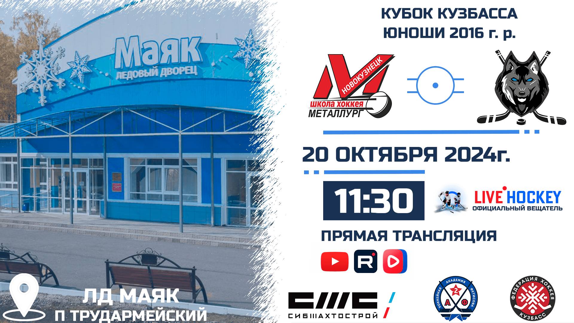 ПРЯМАЯ ТРАНСЛЯЦИЯ МАТЧА ДЮСШ МЕТАЛЛУРГ 2016 (Новокузнецк)-МЕТАЛЛИСТ 2016 (Кемерово). 20.10.2024г. в 11.30 КУБОК КУЗБАССА. Сезон 2024-2025. Комментаторы: Графика: С графикой (таймер, табло). Стадион: ЛД МАЯК п. Трудармейский. ТРАНСЛЯЦИЯ НА YouTube: https://youtube.com/live/nz5O7Y7eG8A?feature=share ТРАНСЛЯЦИЯ В СООБЩЕСТВЕ VK: