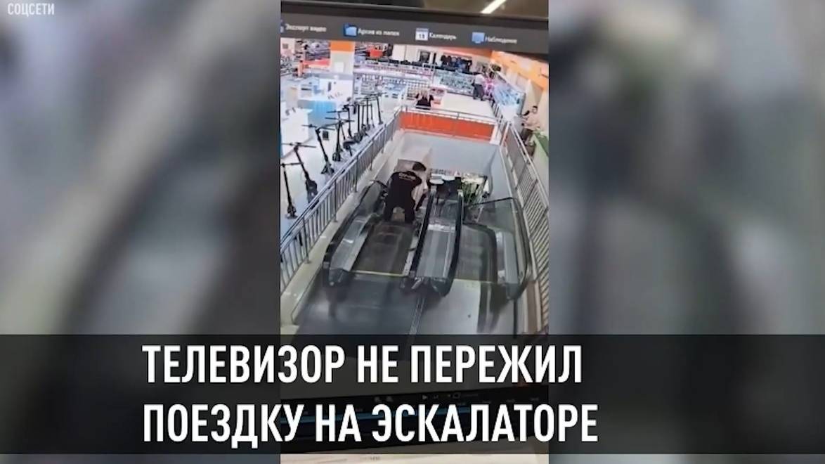 Работники цифрового магазина, которые перевозили телевизор на первый этаж с помощью эскалатора, не рассчитали габариты коробки, и в результате та уперлась в потолок и оказалась смята. По некоторым данным, телевизор стоил не меньше 400 тысяч рублей, а произошла неприятность в одном из ТЦ в Ленобласти.