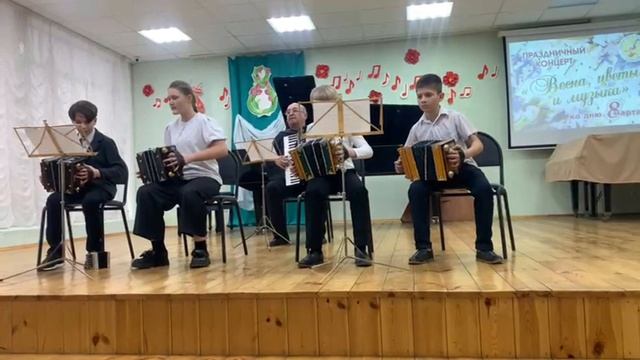 Дети в музыкальной школе играют мелодии из детских мультфильмов на Саратовских гармошках.