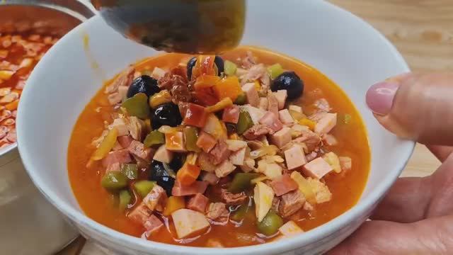 Подпишитесь и по возможности поддержите канал, мы стараемся для Вас реквизиты в описании . Спасибо Вам! СБЕР. 2202 2032 4086 8523 Ингредиенты: 200 грамм мяса 2-3 куриных бедра 2 маленькие или 1 большая луковица 1 морковь 150 грамм маринованных огурцов 1 столовая ложка томатной пасты 150 мл огуречного рассола 1 столовая ложка каперсов 50 грамм оливок 1 чайная ложка соли 1/2 чайной ложки черного перца 60 грамм копченой курицы 50 гр копченой колбасы 50 грамм вареной колбасы лавровый лист Приятного аппетита!